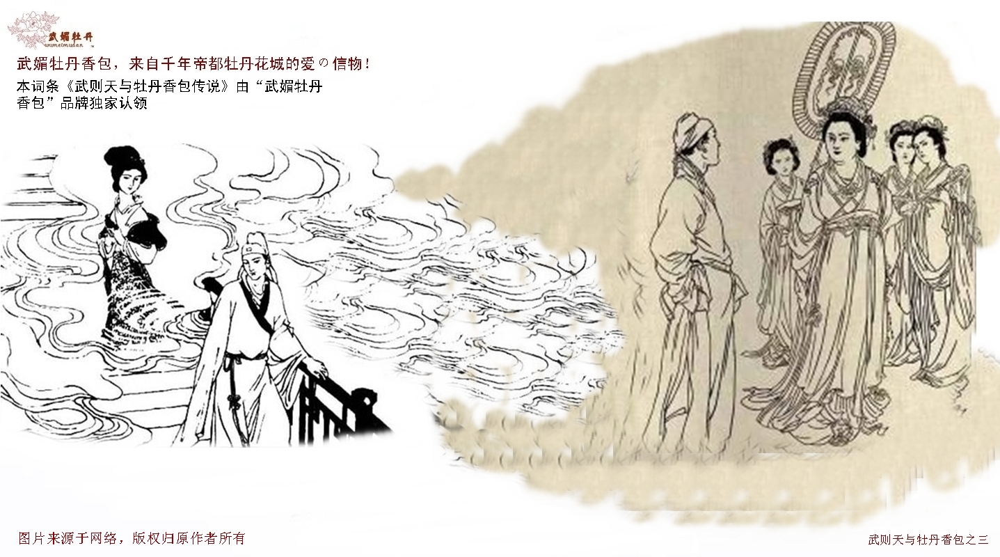 后曹植居洛而梦,见宓妃宓妃托香而语,顿悟佩香神清醒脑聪目明并后思慕不愿而文赋念之。武则天居神都于洛上阳宫是寝,或因宫政诸事时常感身疲精衰不愉,时唤侍陪步涧或洛水畔,抑或见洛水思起曹植宓妃而生发情感,不日便令侍用丹皮及花做香囊佩之,甚悦,精神亦爽。事传京畿及外,民仿而效,牡丹香包谓又名噪一时。